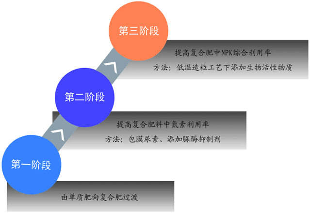 在《土十条》引导下,土壤修复备受关注,同时围绕土壤修复,肥料企业百花齐放。纵观肥料市场发展,不管是出于工艺革新亦或是植入添加剂,其焦点正是提高肥料利用率。在提高肥料利用率方面,从行业发展进程来看大致可分三个阶段:第一阶段是由单质肥向多元肥料过渡,即由过去的单一施用氮肥、磷肥、钾肥逐步转变向施用多元肥料如二元肥、三元肥等;第二阶段是在多元肥的基础上,各企业围绕氮肥进行工艺革新,即在控制氮的流失方面,包膜或添加各种缓释剂如硝化抑制剂、脲酶抑制剂;第三个阶段是综合提高氮、磷、钾利用率,主要方向就是在低温造粒工艺下添加多种生物活性物质,旨在释放土壤中被固定磷肥、钾肥,提高磷肥、钾肥的活性,提高氮、磷、钾的吸收率,从而增产增收。